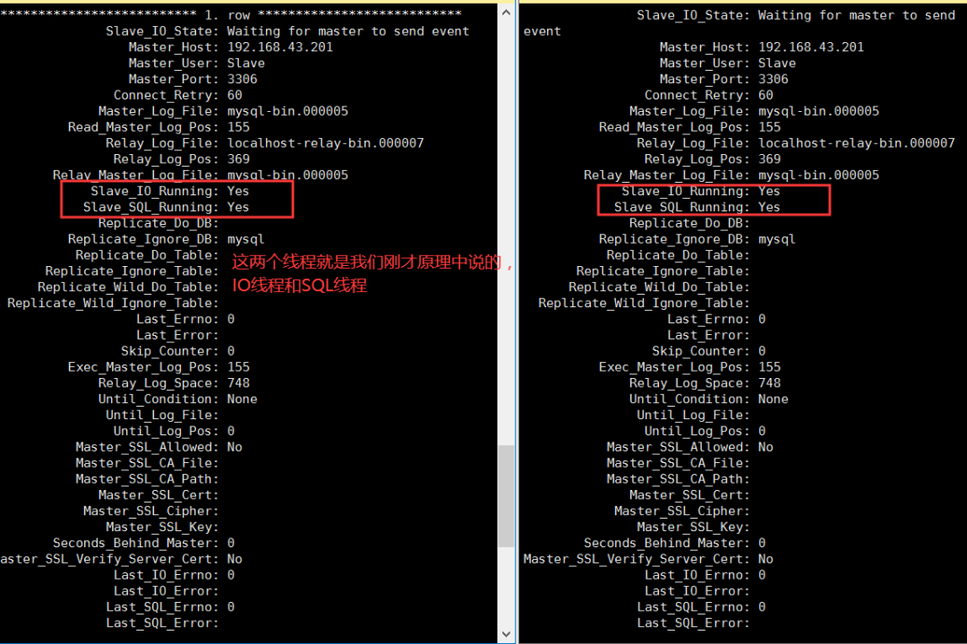 可以看到,在两台Slave的状态中,我们能亲眼看到IO线程和SQL线程的运行状态,这两个线程必须都是yes,才算配置搭建完成。