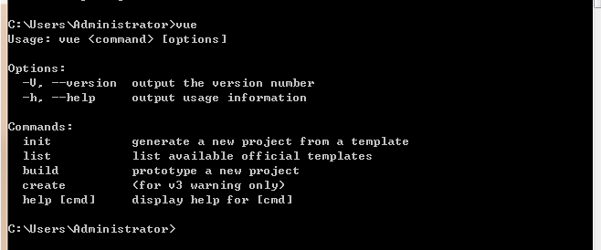 2.等待按照完成后,再在控制台输入vue,如果出现下图,那么就证明按照成功了