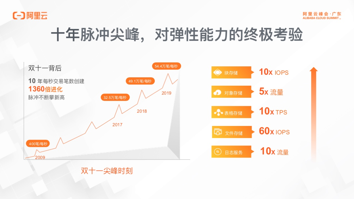 但是企业自建数据中心的速度远远跟不上移动互联网场景下的新型数据场景,特别是脉冲式数据现象。近年来电商带来了脉冲式数据流,特别是以每年阿里的双十一为典型代表。2009年的时候,双11零点峰值交易笔数为400笔/每秒,而到了2019年则达到了54.4万笔/每秒,脉冲式数据峰值十年实现了1360倍的增长,直接导致对各种存储和日志服务需求的十倍和数十倍增长。在阿里双11的带动下,全社会也出现了双11、双12、各种秒杀等脉冲式数据现象。