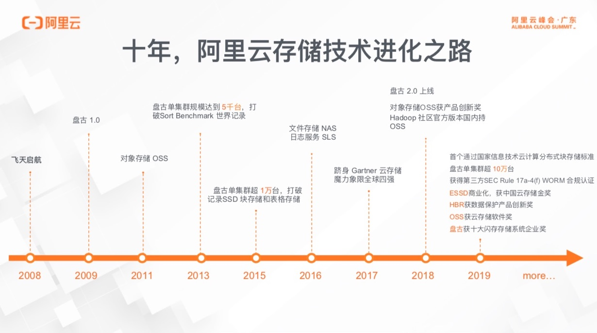实际上,在过去十年里阿里云在存储方面有着大量的创新场景和创新技术,更多是与计算类型相结合的存储技术和系统创新。从2008年开始,阿里云存储在规模化,可靠性、性能和稳定性,便捷性以及软硬一体化等四个方向发展,在这个过程中积累了大量的创新甚至是自研芯片、自研协议和自研硬件以实现更加极致的存储体验。