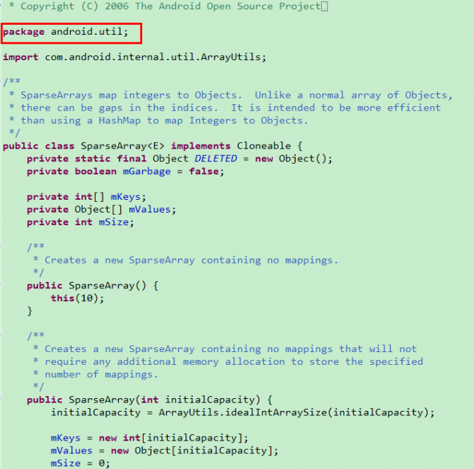 意 思就是说用SparseArray<E>来替代,以获取更好性能。老实说,对SparseArray并不熟悉,第一感觉应该是Android 提供的一个类。按住Ctrl点击进入SparseArray的源码,果不其然,确定是Android提供的一个工具类。