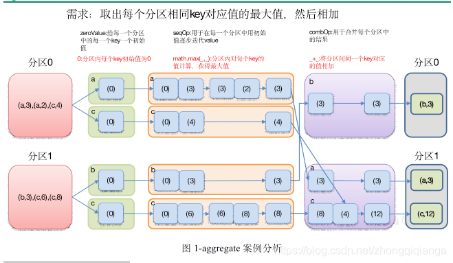 2. 作用:aggregate函数将每个分区里面的元素通过seqOp和初始值进行聚合,然后用combine函数将每个分区的结果和初始值(zeroValue)进行combine操作。这个函数最终返回的类型不需要和RDD中元素类型一致。