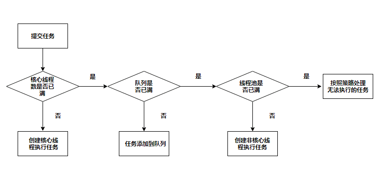corePoolSize参数有关,未满则创建线程执行任务 - 若核心线程池已满,判断队列是否满,队列是否满和