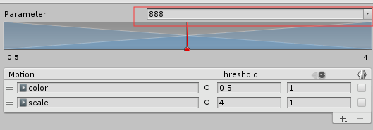 检查器顶部的图表显示了当参数在其最小值和最大值之间变化时,每个动画的影响.每个运动都显示为一个小的蓝色金字塔(第一个和最后一个只显示了一半),如果你点击并按住鼠标左键,相应的运动在下面的运动列表中突出显示. 每个金字塔的顶点都定义了运动具有完全影响力的参数值,即其动画权值为1,其他动画权值为0。这也被称为运动的阈值. threshold