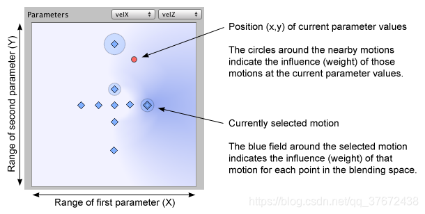每个motion 都用一个棱形表示,拖动红点,表示当前参数的值,棱形的外围有个圆圈,表示红点在该位置是,该动画的权重或者说是影响范围