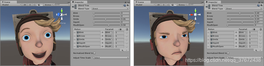 Direct Blend Tree可以直接通过参数来控制动画播放的权重,在面部表情丰富的时候,可以使用这个,因为同时有可能做多个动作,比如皱眉,撅嘴.