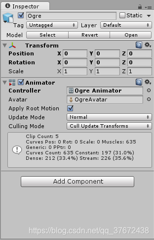 2.在该物体下放置一个角色模型,挂上animator组件,并由自己的avatar,和animator controller