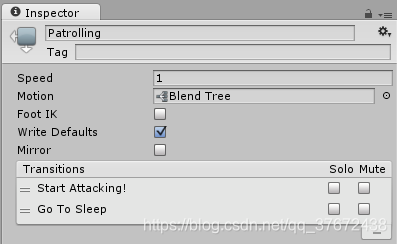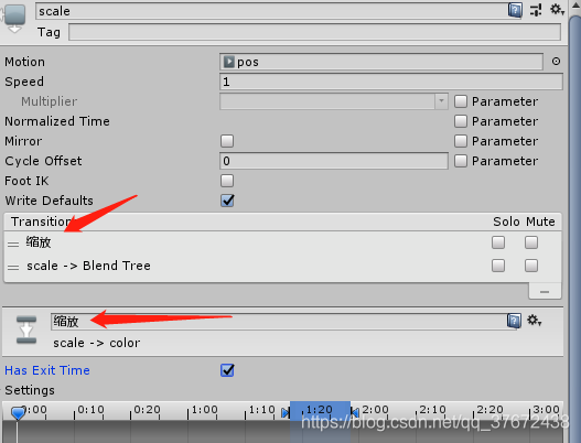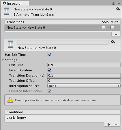 | Exit Time | 如果勾选上Has Exit Time ,这个值表示,动画播放到什么多少的时候开始转换到下一个动画. 比如0.75就表示该动画播放到75%的时候,就开始转换. 对于循环动画,exit time小于 1的效果比较好 如果Exit Time大于1 ,比如 3.5 ,表示进行3圈半的循环. |