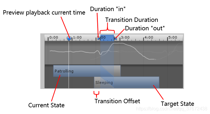 | Transition Duration | 转换的时间,取决于当前动画的时间. 在过渡图中,可以将其可视化为两个蓝色标记之间的部分。 |