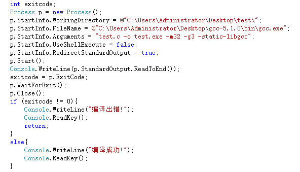 p.StartInfo.FileName = @"C:\Users\Administrator\Desktop\gcc-5.1.0\bin\gcc.exe";