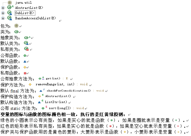 在eclipse中这些访问控制符是通过一个个鲜明的标示来区别的,熟练的掌握这些标示,对我们阅读源码非常有帮助,我们可以迅速的知道类和方法的特点,从而能更好的理解代码的层次关系。eclipse中常用的一些访问控制符包括下面所示的内容: