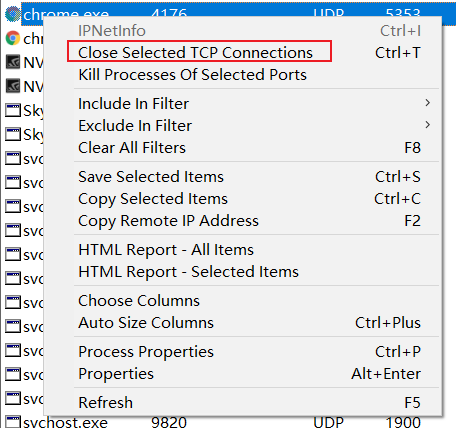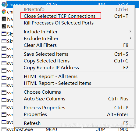 对于可疑的应用程序,怀疑为木马病毒时,可以点击右键选择close selected tcp connections,即关闭选定的tcp连接,进行关闭,然后观察该程序是否会打开新的端口,如果还会自动打开新端口,则可以定位到该程序的具体位置,根据程序的路径、名称等信息进行进一步的判断。