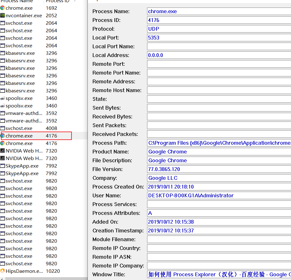 选中某一个应用程序,双击可显示其详细信息,例如双击谷歌浏览器进程,显示信息如下图。