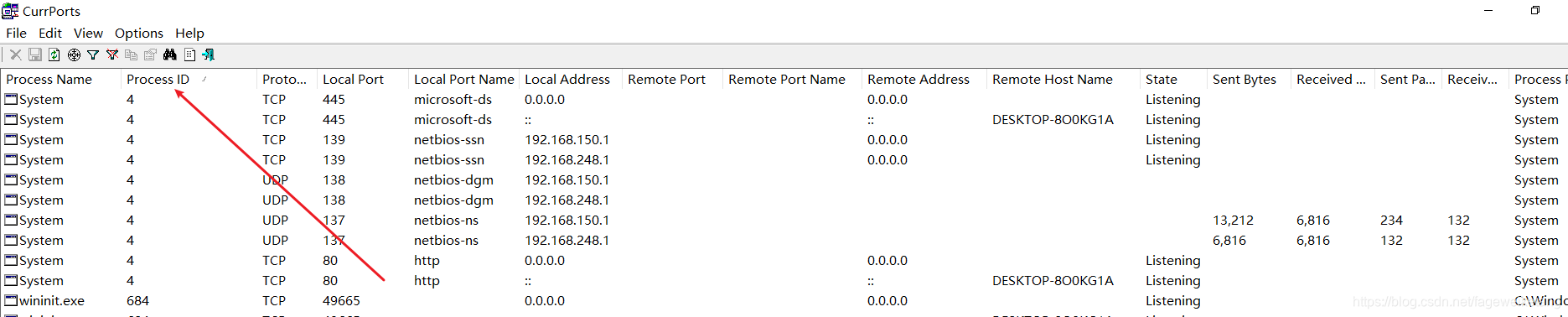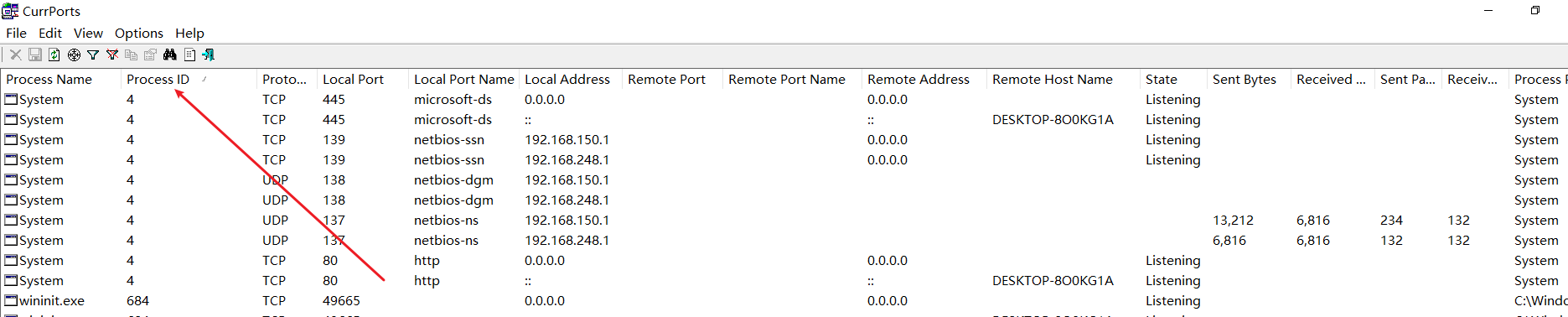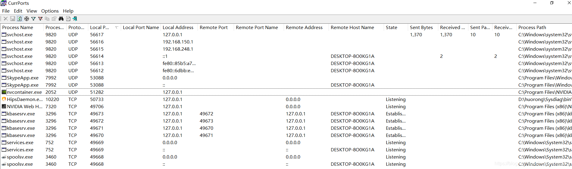 CurrPorts运行后即可看到应用程序的进程名称、进程id、协议、本地端口、本地地址、远程端口、远程地址、进程路径等信息,如下图。