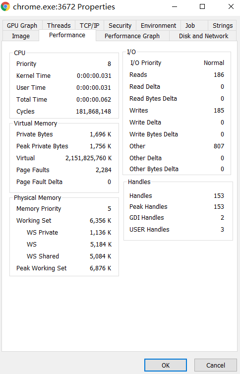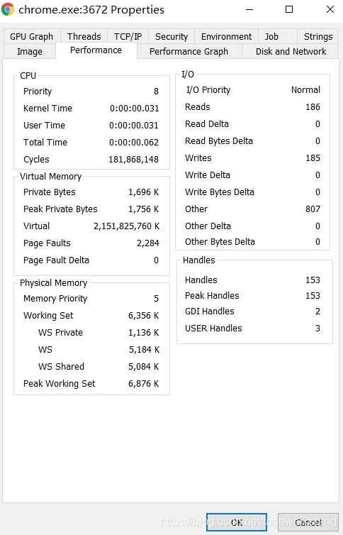 另外,双击进程可弹出属性框,可查看安全、性能、线程等信息。如下图。