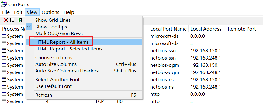 Currports也支持多个进程选中进行关闭操作,同时currports也可以将列表信息进行报告导出,为html格式,在view菜单栏下的html report即可导出,如下图。