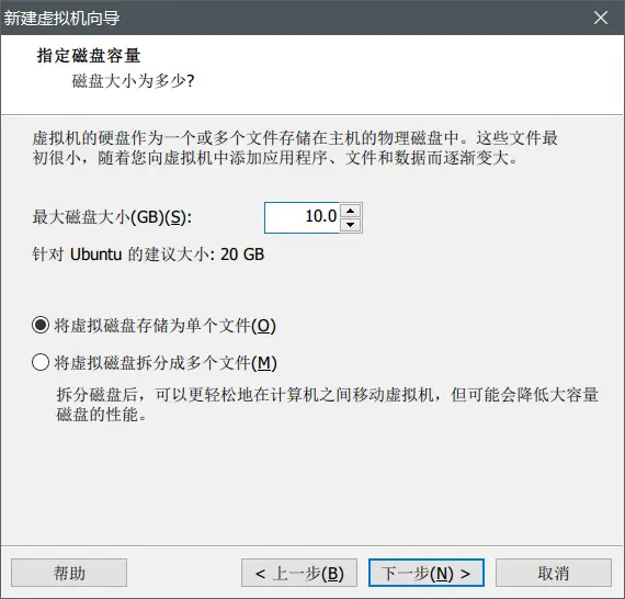 指定虚拟机磁盘大小,建议不小于 15GB;