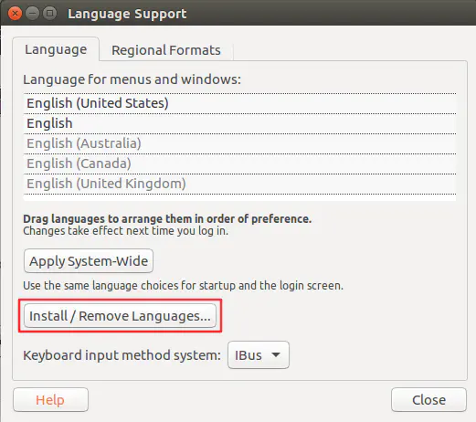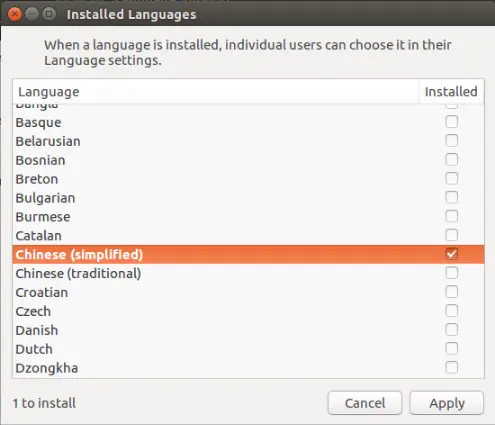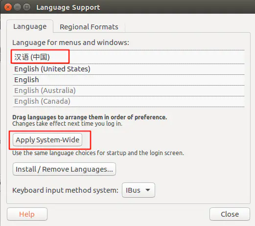 语言安装完成后,还需用鼠标将简体中文拖动到语言列表最顶端(如图),然后选择「Apply System-Wide」(应用至系统),语言更改需要注销再重新进入系统才会生效。
