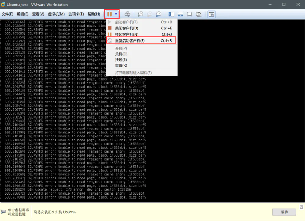 安装完成后,虚拟机会自动重启,也可以按照图中操作强制重启;