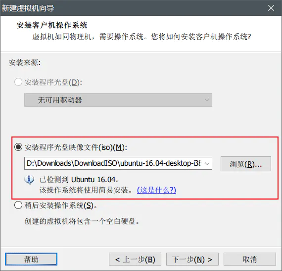 选择「安装程序光盘映像文件(iso」,选择下载到本地的 Ubuntu 镜像;