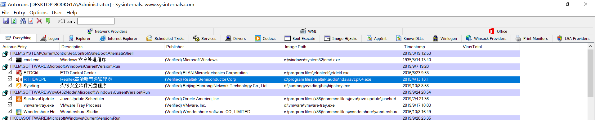 打开autoruns后会看到everything栏,此栏列出了自动启动项,如下图。