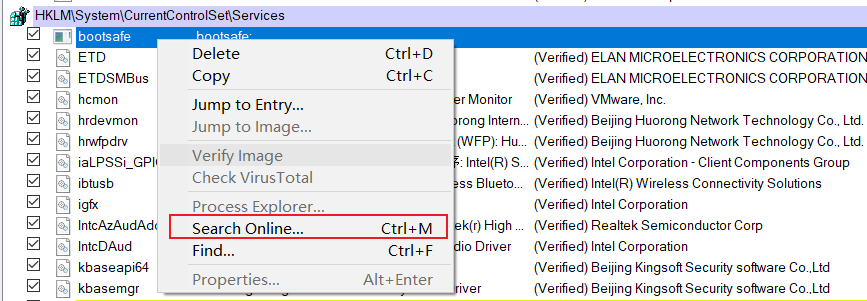 木马程序是没有数字签名的,我们可以多关注其description和publisher栏,如果都为空,而又不确定是否为木马程序,则可以选中右键search online进行在线搜索,个人认为如果搜索没有相应的名称结果,则木马可能性比较大,毕竟攻击者随意为木马取个名称是搜不出的。