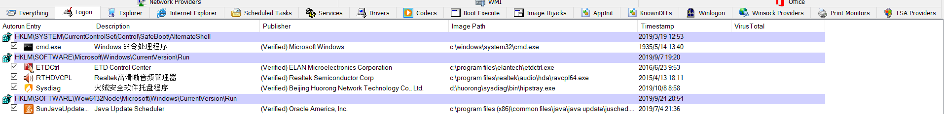 切换到logon栏列出了登录加载项,查看和排除方式与everything类似。