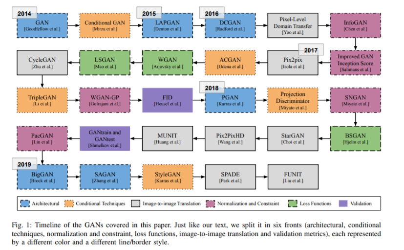 今天看到很好的一篇论文,总结了整个GAN六年的发展,主要以计算视觉为主。论文题目是 The Six Fronts of the Generative Adversarial Networks。大家可以参考一下。如果大家是搞医学图像的,还可以参考这篇文章:GANs for Medical Image Analysis