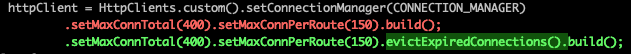 问题定位了,应该是就是这个配置导致的!(线程上升的时间点和发布时间点完全吻合!),于是先把这个新加的配置给干掉上线,上线之后线程数果然恢复正常了。那 evictExpiredConnections 做了什么导致线程数每时每刻在上升呢?这个配置又是为了解决什么问题而加上的呢?于是找到了相关同事来了解加这个配置的前因后果