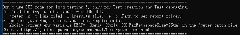 其实每次使用jemter.bat文件启动JMeter时,命令行窗口都会提示我们不要使用GUI窗口进行测试,除非是进行调试脚本