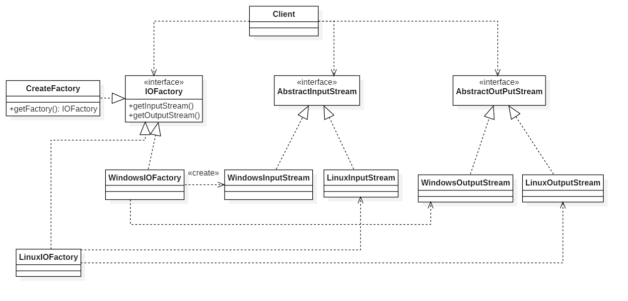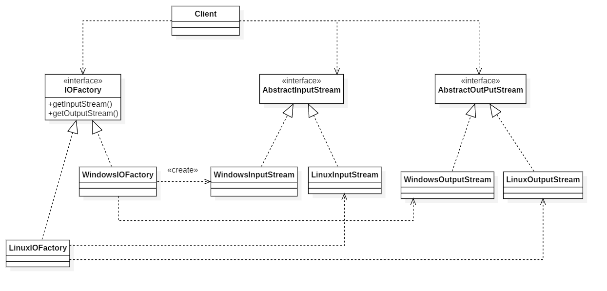 现在,要将Windows的IO流变为Linux的IO流;只需要按照上面的类图,实现一个Linux的工厂,用来创建Linxu的IO流,然后在实现Linux的产品(Linux的IO流),对于场景类,仅需要修改创建的工厂就。