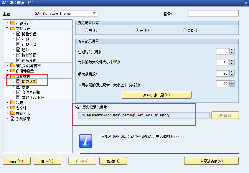 第一步,登录SAP,找到“定义本地布局”按钮,选择“选项”菜单。 第二步,选择“本地数据”中的“历史记录”,复制历史记录的目录地址,在我的电脑中打开该文件夹。 第三步,把该文件夹下的文件全部删除掉。 第四步,重新登录SAP,搞定。 来源:https://blog.csdn.net/beyondamos/article/details/99291956 标签 sap