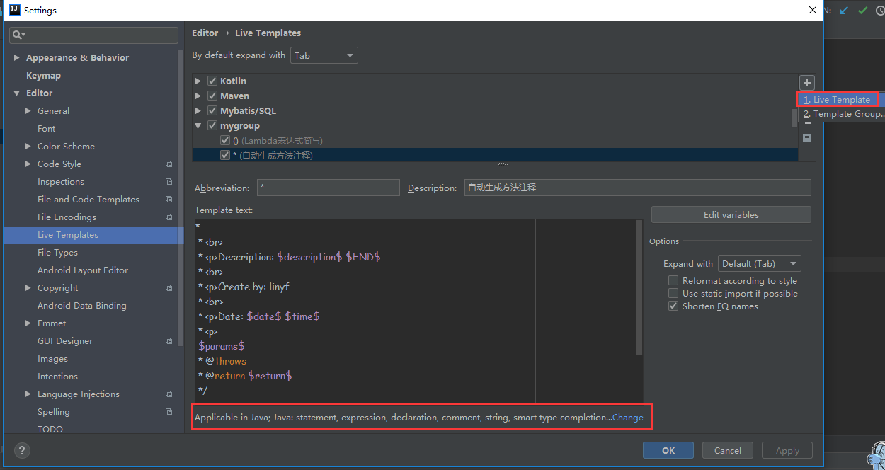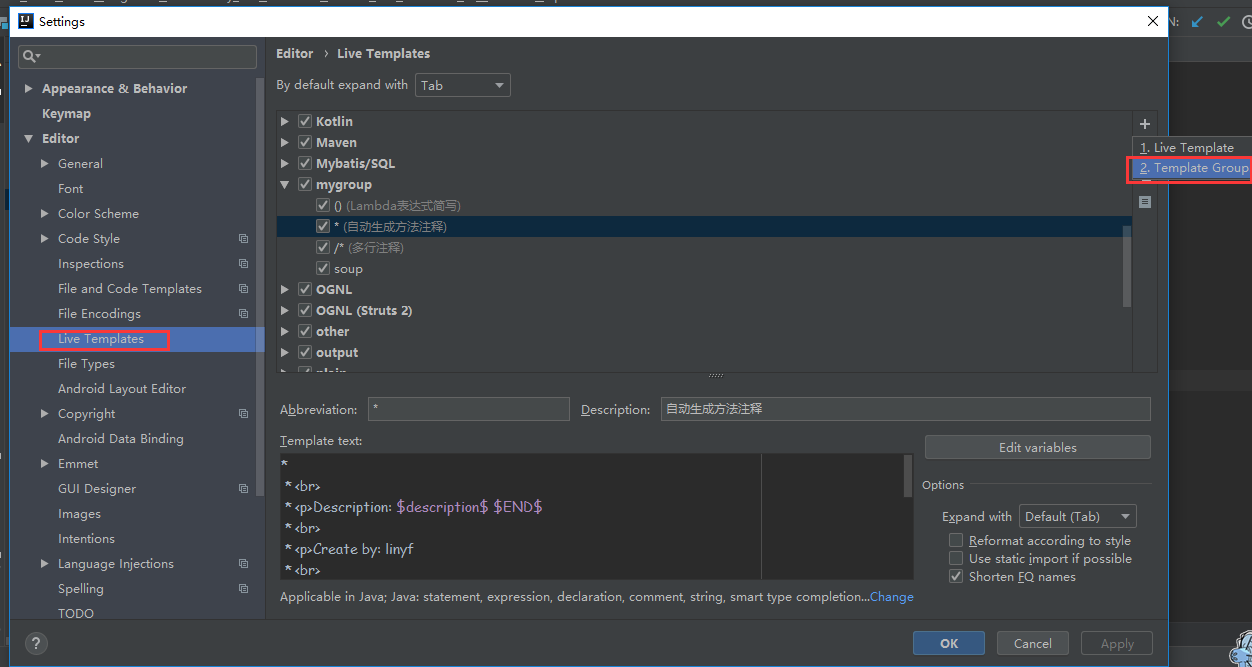 (1)File - Settings - Editor - Live Templates - 右边“+” 添加一个Templates Group - 然后选中自己的Group再次点击“+”添加Live Templates