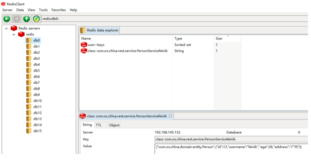 第一次通过用户名称来查找用户可以看到是从库中查询的数据,我们可以通过RedisClient工具来查看数据已放入了缓存
