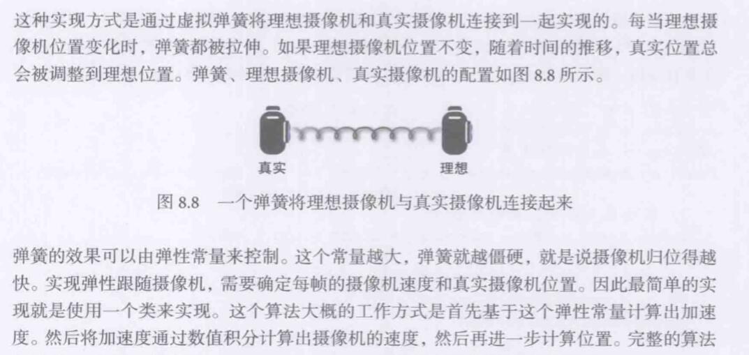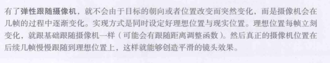 弹性摄像机的最大好处就是当目标对象旋转的时候,摄像机会有一定的延迟才开始转动。旋转出来的效果要比基础跟随摄像机要好得多。弹性摄像机效果比基础跟随摄像机好很多,都是计算量没多多少。