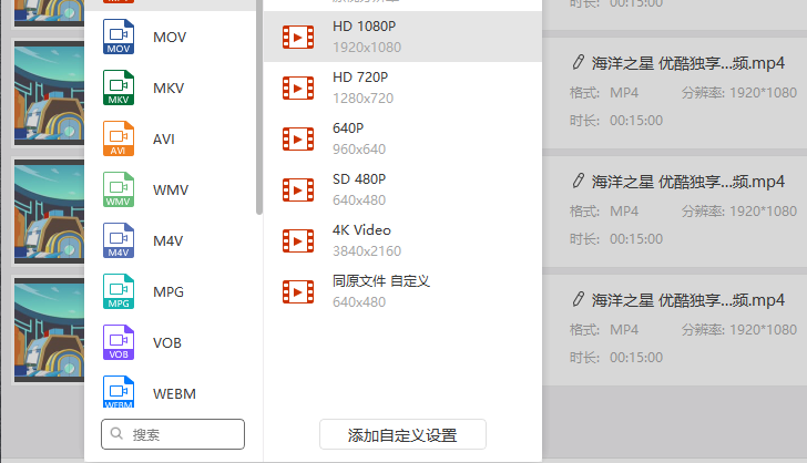 3、如果需要设置输出mp4视频的更多分辨率可以点击自定义设置,然后选择参数,