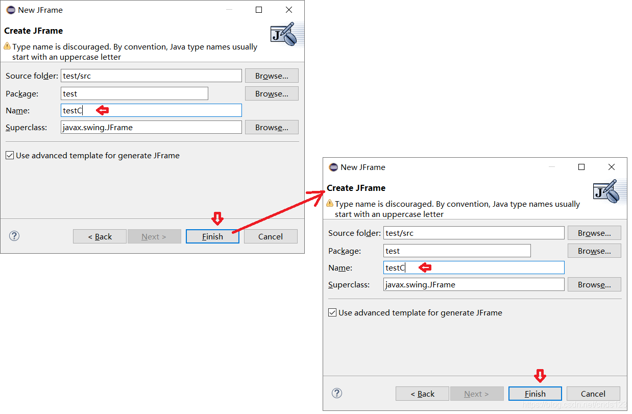 输入类名,将超级类(Superclass)改为javax.swing.JFrame ,并选中public static void main(String[] args),单击Finish按钮