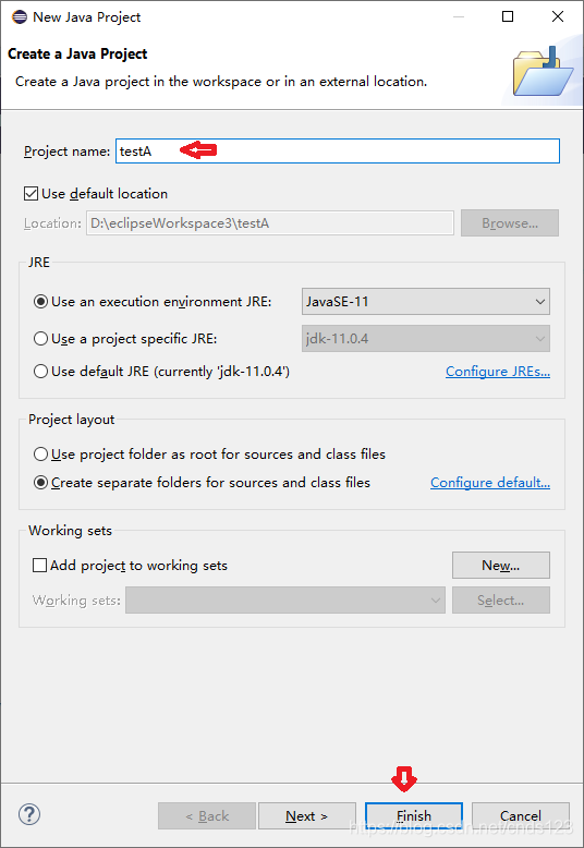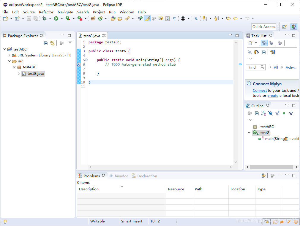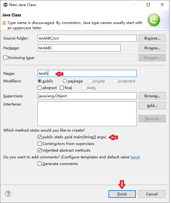 输入类名:testG ,选中public static void main(String[] arge),单击“Finish”按钮