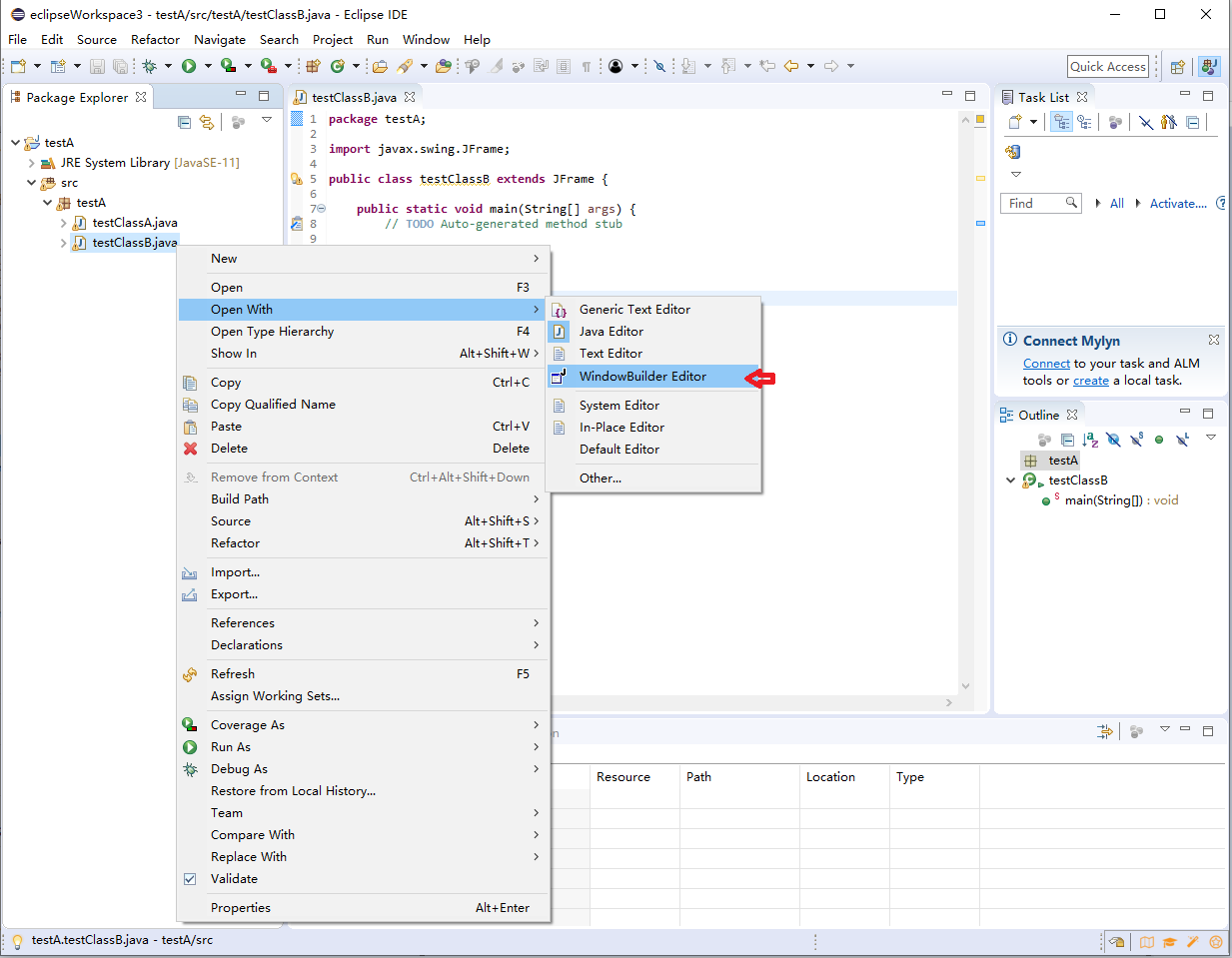 创建的类文件testClassA,并立即出现在右侧导航栏中,并将出现WindowBuilder设计视图窗口,在窗口的左下角(箭头标识处),有两个选项卡:Source和Design, Source选项卡显示文本代码,Design选项卡显示设计视图。参见下图: