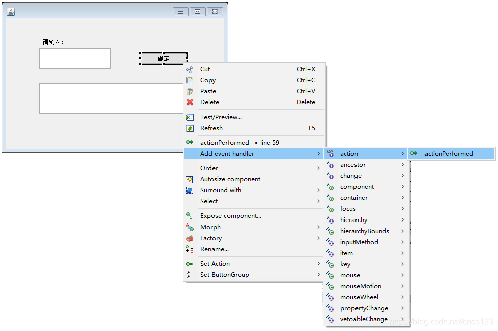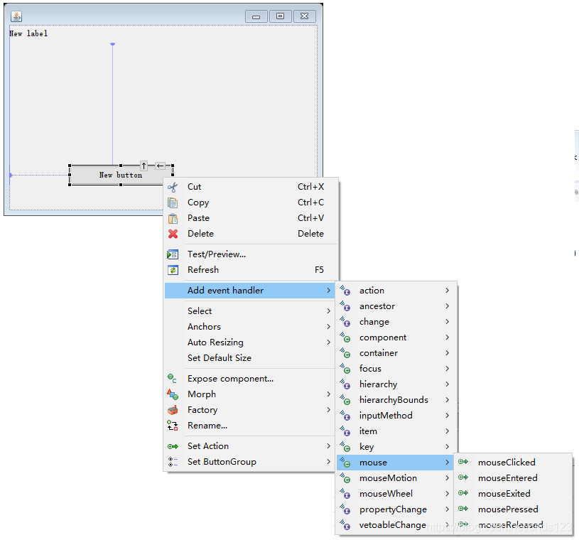 为部件添加鼠标或键盘事件,右击它出现右键快捷菜单: