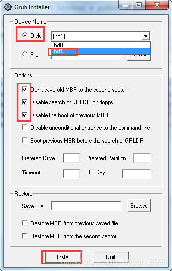 选中Disk,然后选择需要写入MBR的磁盘,注意,不能搞错,如果无法判断哪个是U盘,请将U盘拔掉,然后再打开制作工具,看看少了哪个盘,这样就知道哪个是U盘了,一般来讲,hd1就是U盘。该勾选的勾选上,最后点击Install,MBR就写入了,这时候,此U盘就是可启动的U盘了,相应的BIOS里面也可以看到启动选项了。