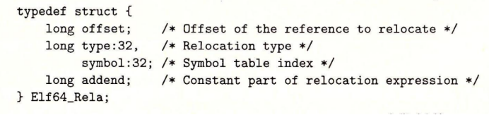 ELF重定位条目的格式如下所示,其中offset是需要被修改的引用的节偏移,symbol标识被修改引用应该指向的符号,type告诉链接器如何修改心的引用,attend是一个由符号常数,一些类型的重定位要用它对被修改引用的值做偏移调整。