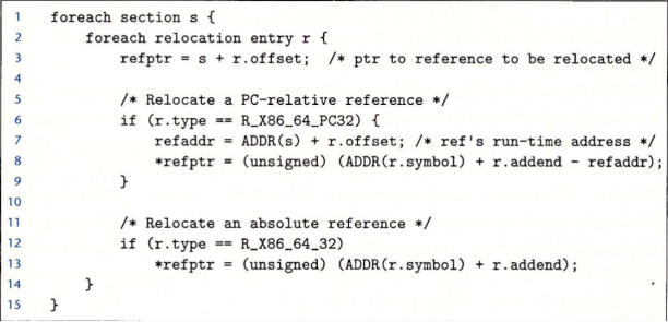 第1行和第2行表示遍历每个节s中的每个节相关联的重定位条目r。为了更具体的描述,我们假设每个节s是一个字节数组,每个重定位条目r是一个类型位ELF64_Rela的结构,如7.1节中的定义。另外,当算法运行时,重定位已经完成了第一步:重定位节和符号定义,这样链接器就为每个节(ADD(s)表示)和每个符号(ADDR(r.symbol))都选择了运行时地址。第3行计算的是需要被重定位的引用的地址,如果这个引用使用的是PC相对寻址,那么就用第5~9行来进行重定位。如果该引用使用的是绝对地址,那么就通过第11~13行来重定位。