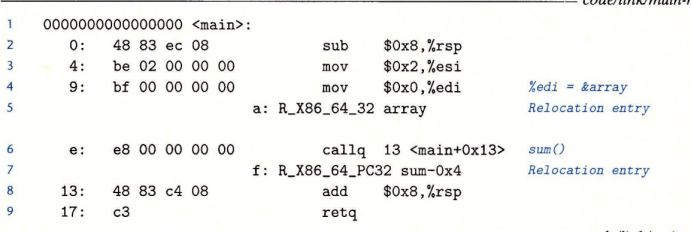 第6行,main函数调用sum函数,sum函数是在模块sum.o中定义的。call指令开始于节便宜0xe的地方,第一个字节0xe8是操作码,后面跟着的是对目标sum的32位PC相对引用的占位符,表明该位置是保留存放相对地址的。