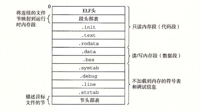可执行目标文件的格式类似于可重定位目标文件的格式。ELF头描述文件的总体格式。它还包括程序的入口点,也就是当程序执行时第一条指令的地址。.text、.rodata和.data节与可重定位目标文件中的节是类似的,除了这些节已经被重定位到它们最终的运行时内存地址以外。.init节定义了一个小函数,叫做_init,程序的初始化代码会条用它。因为可执行文件是完全链接的(已被重定位),所以它不需要.rel节。