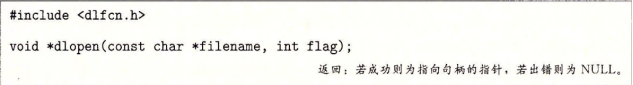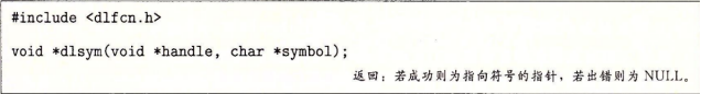 dlsym函数的输入是一个指向前面已经打开了的共享库的句柄和一个symbol名字,如果该符号存在,就返回符号的地址,否则返回NULL: