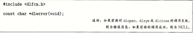 dlerror函数返回一个字符串,它描述的是调用dlopen、dlsym或者dlclose函数时发生的最近的错误,如果没有错误发生,就返回NULL: