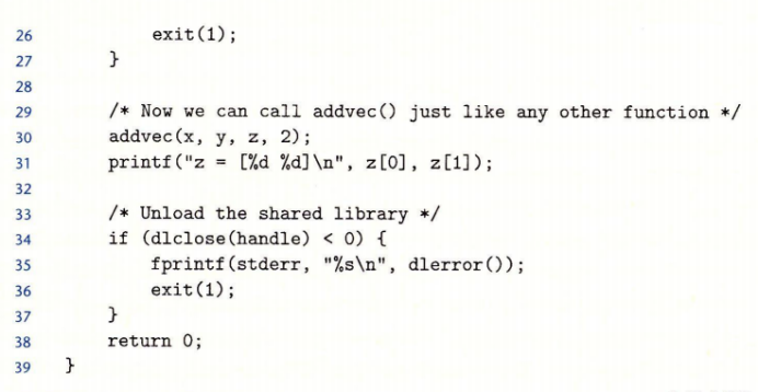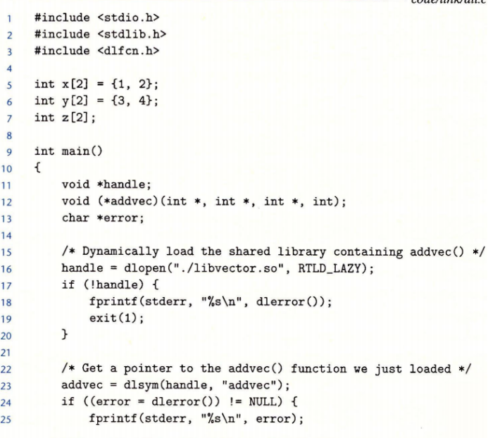下面的一个例程中,展示了如何用这个接口动态的链接一个名叫libvector.so的共享库,然后调用其中的addvec函数。要编译这个程序,我们使用以下的命令: