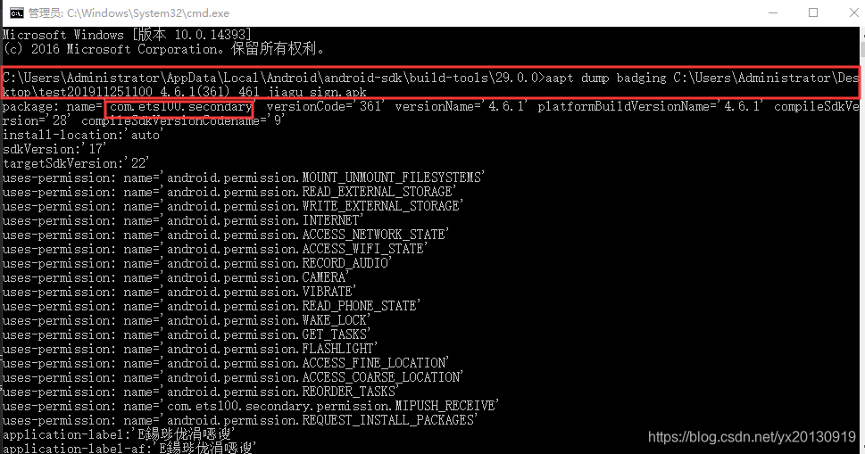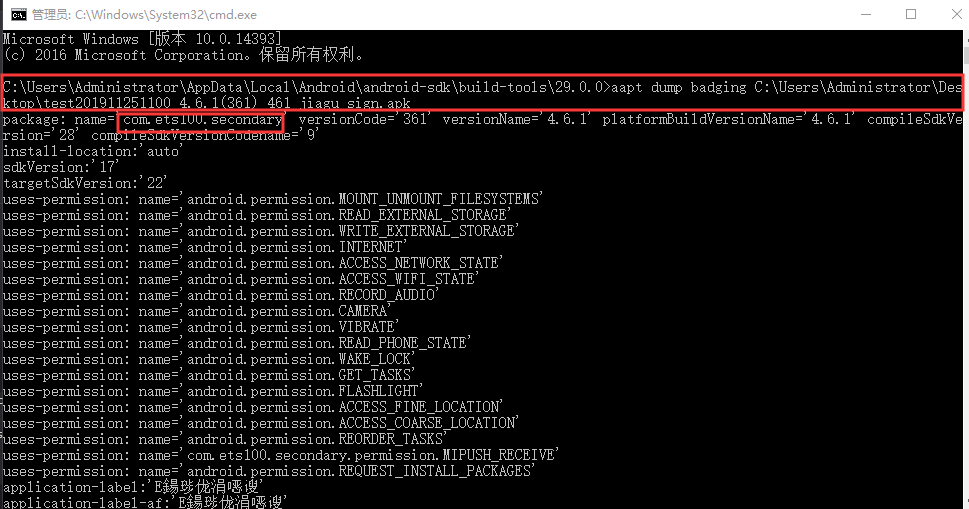 (4)、'appPackage'和'appActivity'可以通过cmd命令aapt dump badging + ”APK位置“来查看(apk的路径可以先放在电脑桌面,使用电脑桌面的路径),如图: