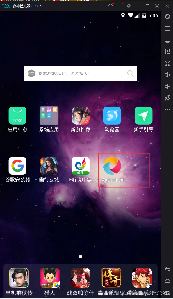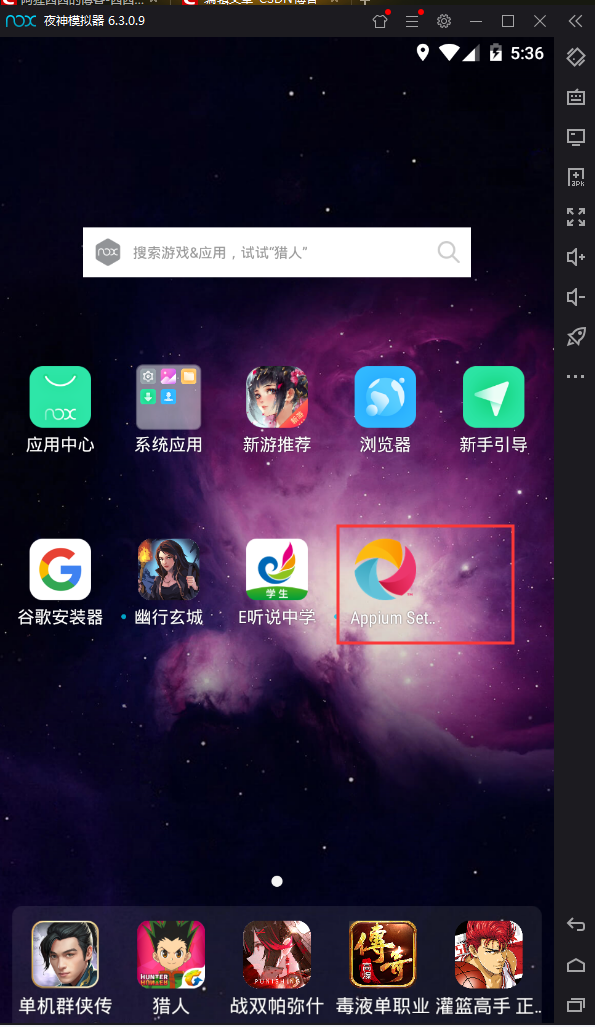 使用夜神模拟器的时候先在夜神模拟器桌面生成appium setting,之后再次运行就把App启动起来了。